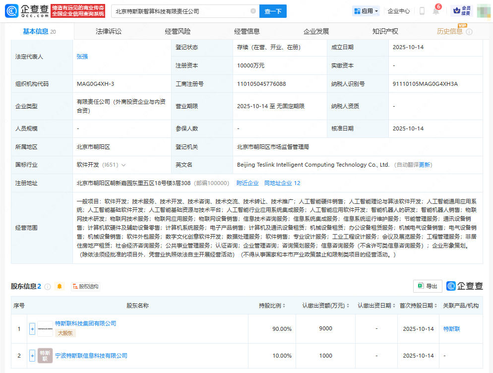 近日,北京特斯联智算科技有限责任公司成立,法定代表人为张强,注册资本1亿元人民币,经营范围涉及人工智能理论与算法软件开发、人工智能基础软件开发、人工智能基础资源与技术平台、人工智能行业应用系统集成服务、智能机器人的研发等。企查查股权穿透显示重庆配资炒股,该公司由特斯联科技集团有限公司、宁波特斯联信息科技有限公司共同持股。